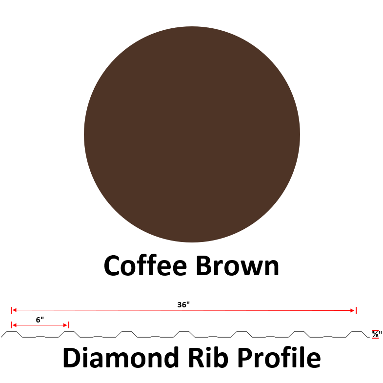 36" wide profile with 5/8" high trapezoidal ribs, 6" on center with one minor rib between the major ribs.