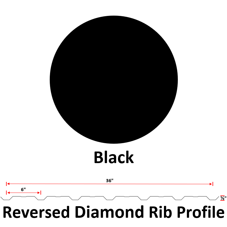 36" wide profile with 5/8" high trapezoidal ribs, 6" on center with one minor rib between the major ribs.