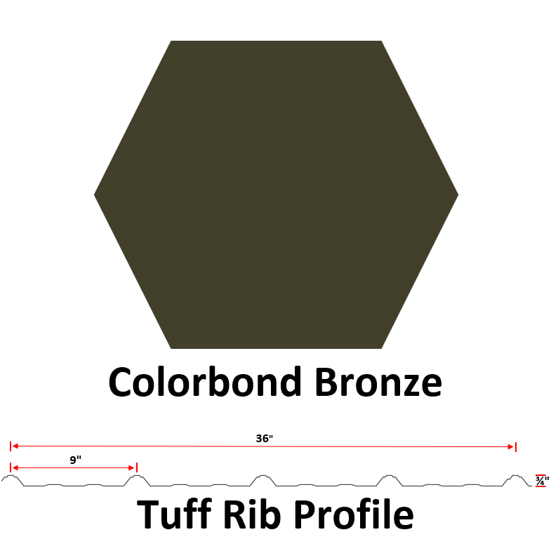 28GA. 36" wide profile with 3/4" high trapezoidal ribs, 9" on center with two minor ribs between the major ribs.
