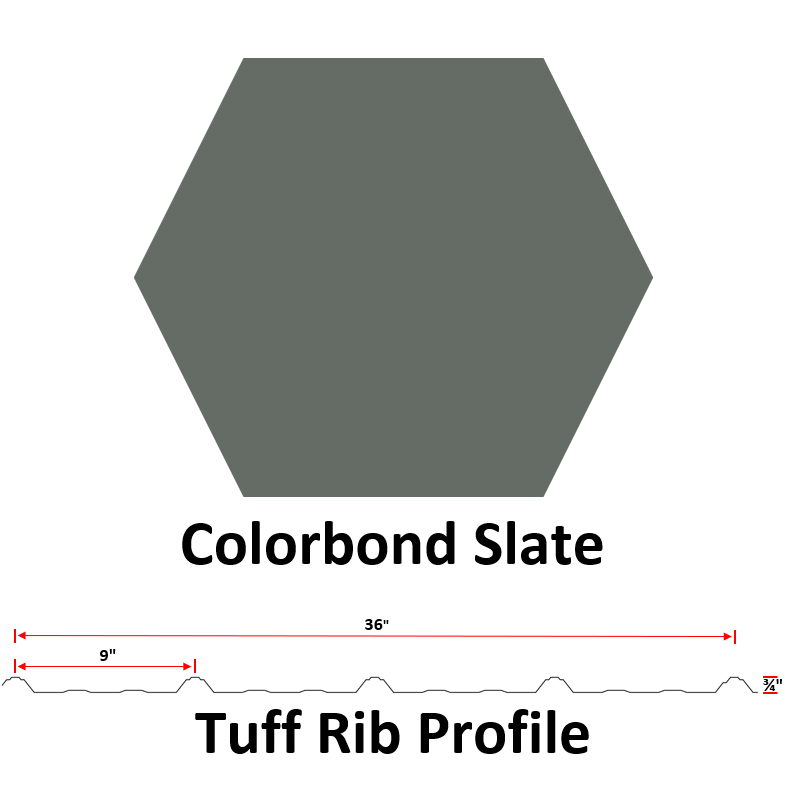 28GA. 36" wide profile with 3/4" high trapezoidal ribs, 9" on center with two minor ribs between the major ribs.