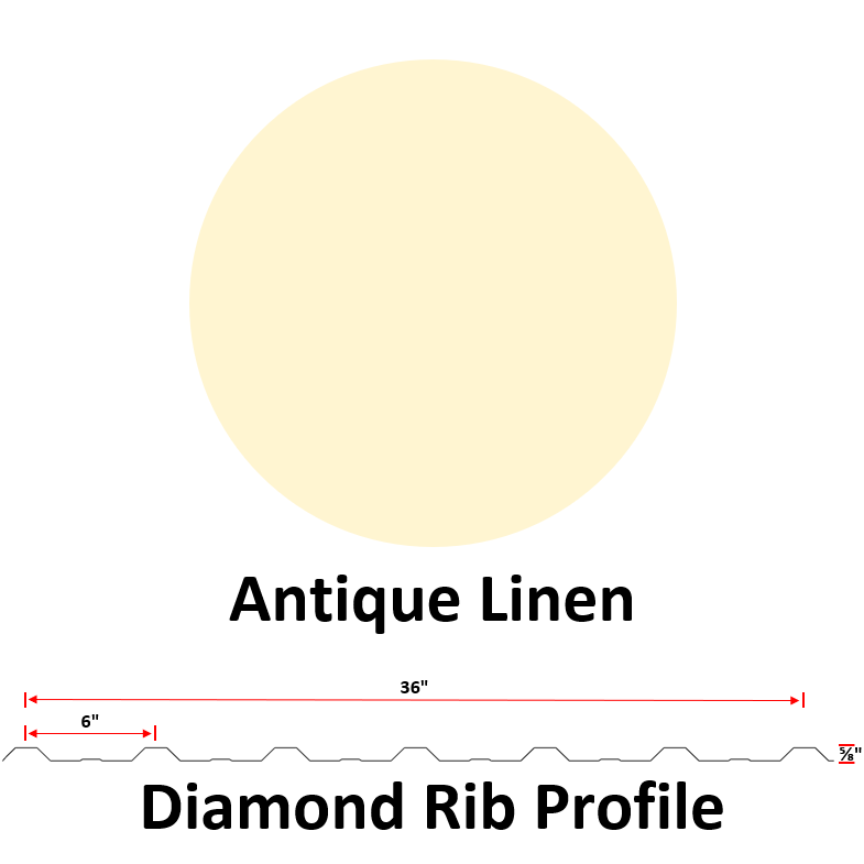 36" wide profile with 5/8" high trapezoidal ribs, 6" on center with one minor rib between the major ribs.