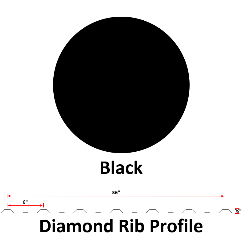 36" wide profile with 5/8" high trapezoidal ribs, 6" on center with one minor rib between the major ribs.