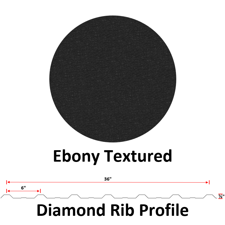 36" wide profile with 5/8" high trapezoidal ribs, 6" on center with one minor rib between the major ribs.