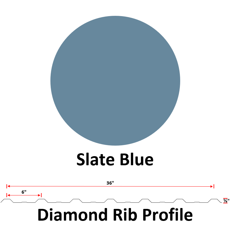 36" wide profile with 5/8" high trapezoidal ribs, 6" on center with one minor rib between the major ribs.
