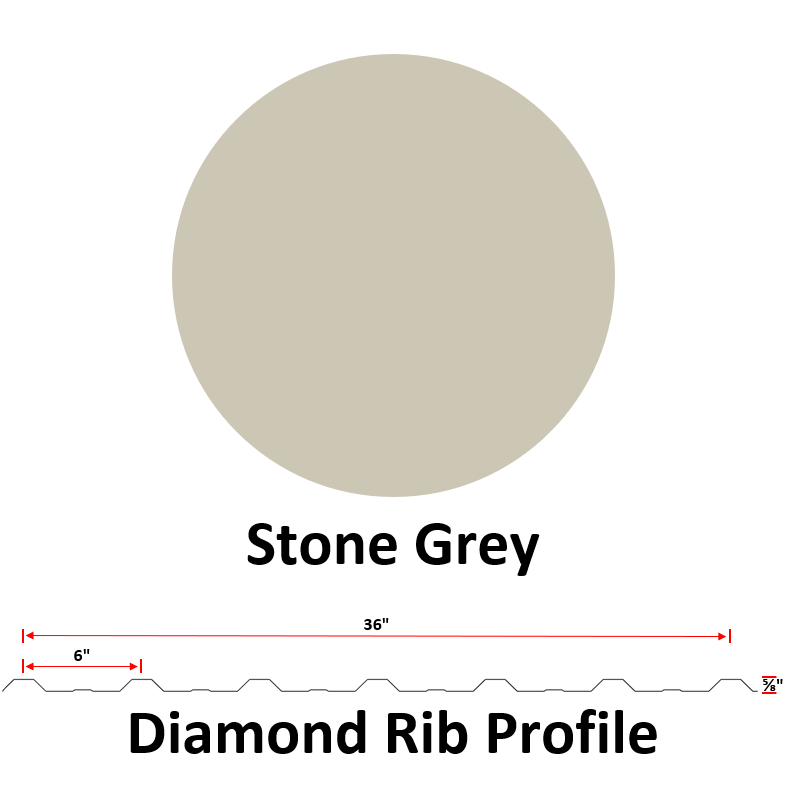 36" wide profile with 5/8" high trapezoidal ribs, 6" on center with one minor rib between the major ribs.