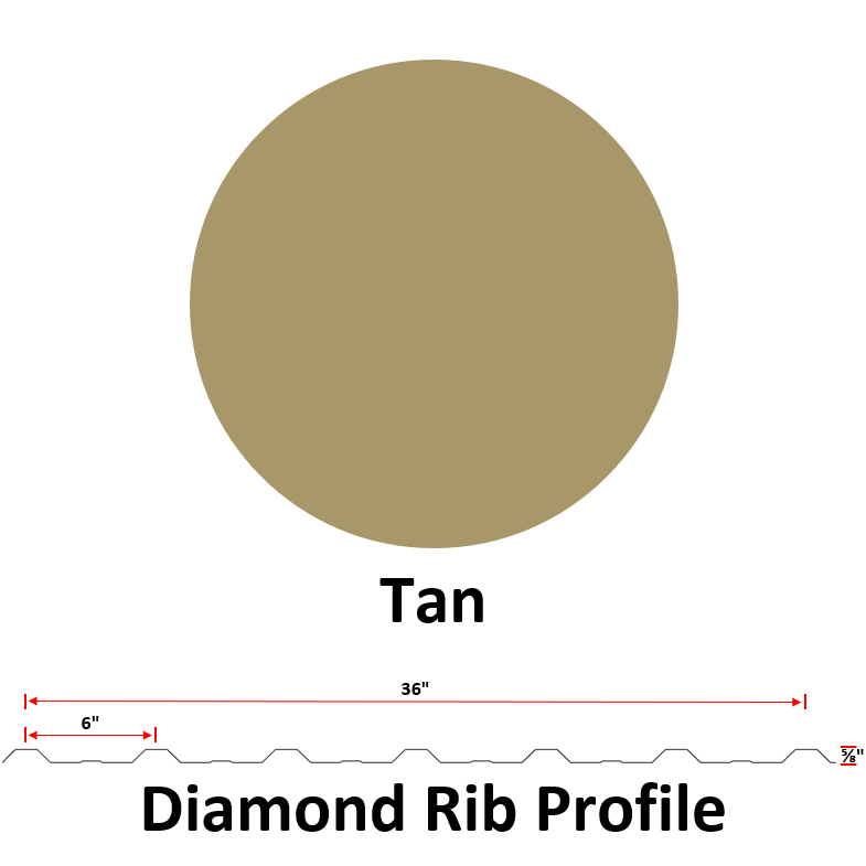 36" wide profile with 5/8" high trapezoidal ribs, 6" on center with one minor rib between the major ribs.