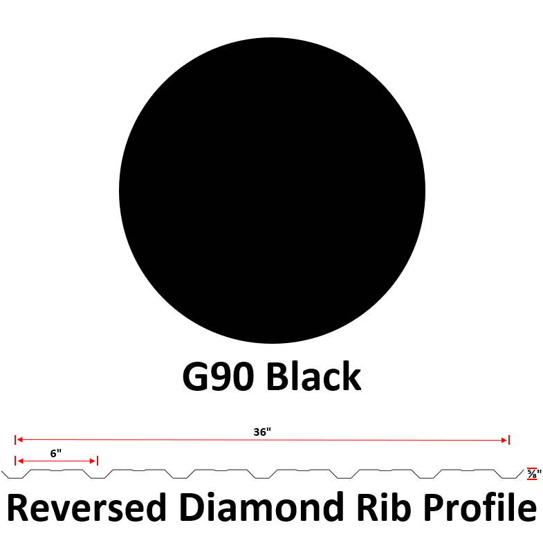 36" wide profile with 5/8" high trapezoidal ribs, 6" on center with one minor rib between the major ribs.