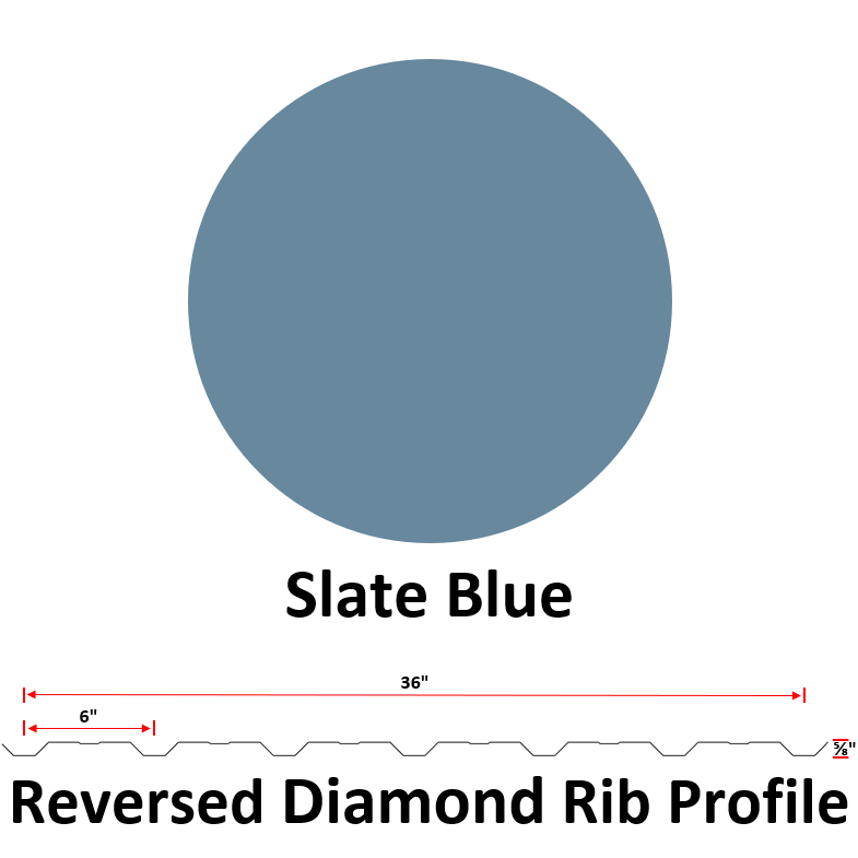 36" wide profile with 5/8" high trapezoidal ribs, 6" on center with one minor rib between the major ribs.