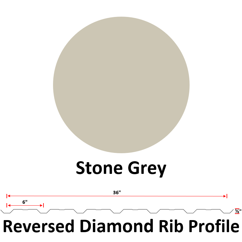 36" wide profile with 5/8" high trapezoidal ribs, 6" on center with one minor rib between the major ribs.