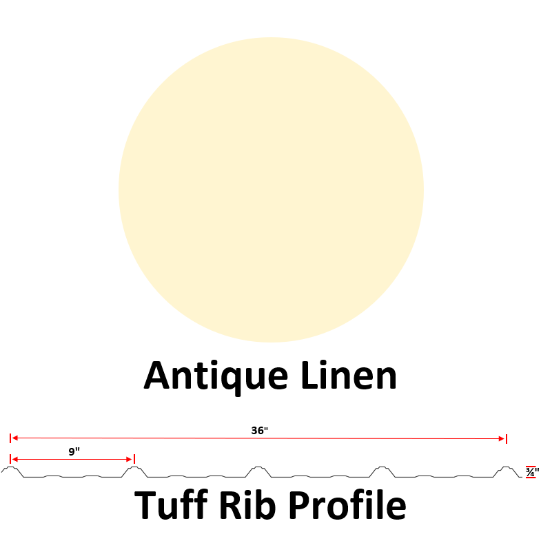 36" wide profile with 3/4" high trapezoidal ribs, 9" on center with two minor ribs between the major ribs.