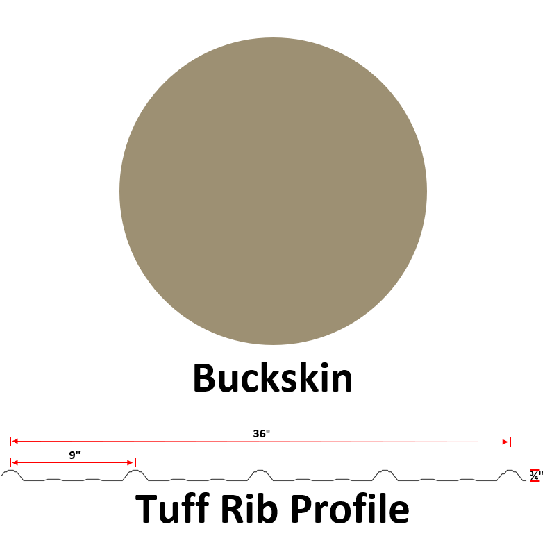 36" wide profile with 3/4" high trapezoidal ribs, 9" on center with two minor ribs between the major ribs.